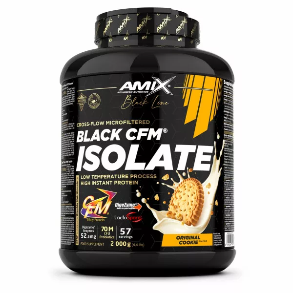 AMIX Amix® Black Line Black CFM® Isolate 2000 g – Original Cookie (Süti) ízű prémium CFM® technológiával készült tejsavófehérje-izolátum, amely emésztő enzimeket is tartalmaz a gyorsabb felszívódás és jobb hasznosulás érdekében. Magas fehérjetartalma, alacsony zsír- és szénhidráttartalma ideálissá teszi izomépítéshez, regenerációhoz a diétás időszakban is, valamint a különleges Süti íz élvezetessé is a fogyasztást.