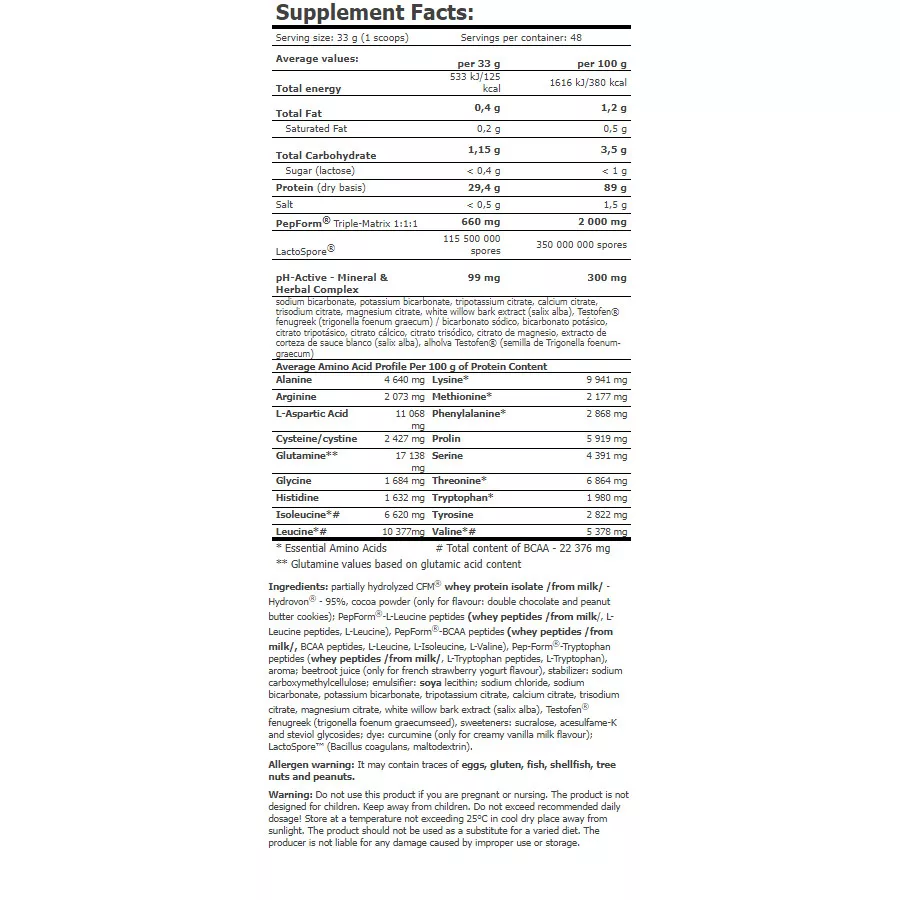 A tejsavófehérje-izolátumok hidrolizálásával, hogy a nagyobb fehérjéket kisebb darabokra bontsák, ezek az ultratiszta tejsavó-izolátumok gyorsan bejuthatnak a szervezetbe. Ez az ultratiszta és gyorsan emészthető formula emellett egyedülálló PepForm™ Peptide Triple-Matrix-szal, pH-Active Complex-szel és lactobacillus sporogenes LactoSpore® - val van átitatva .