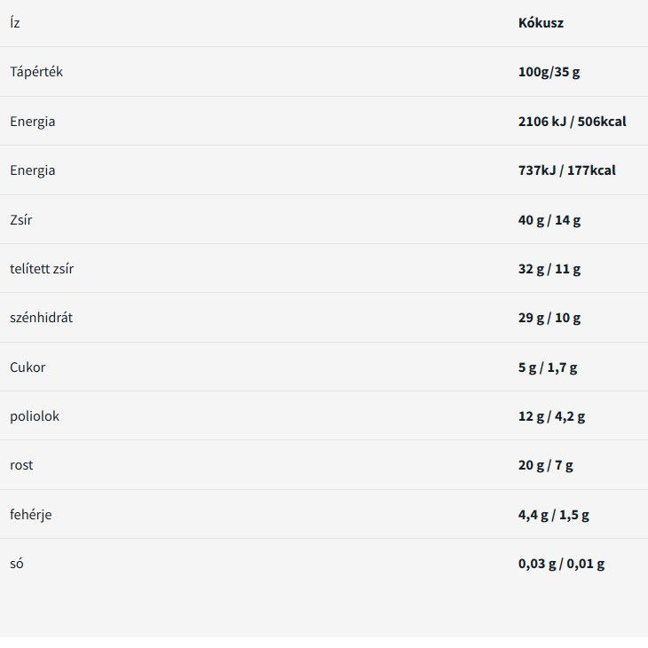 Kókusztejpor (friss kókusztej), kókuszreszelék, frukto-oligoszacharid, izomalto-oligoszacharid*, étcsokoládé édesítőszerrel (kakaómassza, édesítőszer (maltitol), kakaóvaj, emulgeálószer: napraforgó lecitin) kókuszzsír, antioxidáns (rozmaring kivonat).