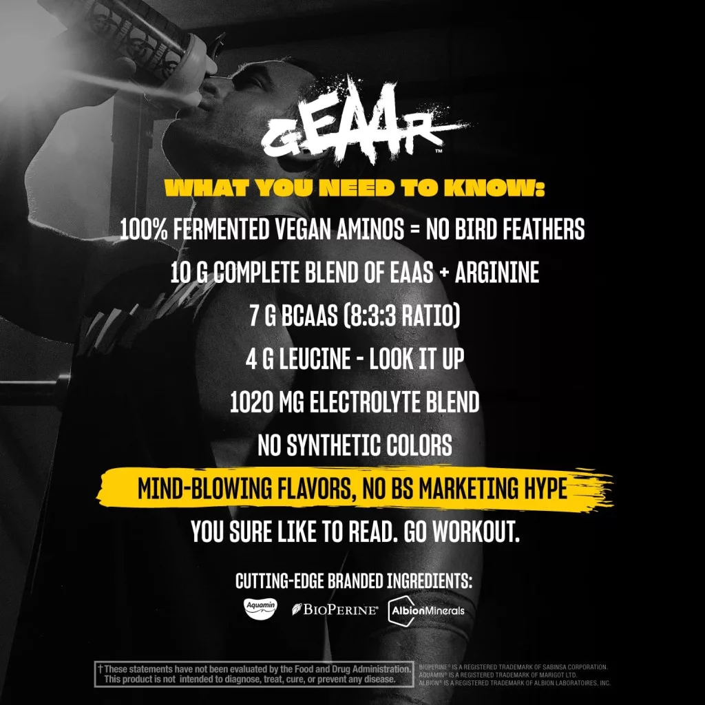 A BCAA-k (elágazó láncú aminosavak) változó arányú leucint, izoleucint és valint tartalmaznak. Az EAA-k 9 aminosavat tartalmaznak, köztük a 3 BCAA-t, amelyek mindegyikét a szervezet nem képes önmagában termelni. A MUTANT GEAAR mind a 9 aminosavat + arginint tartalmaz.